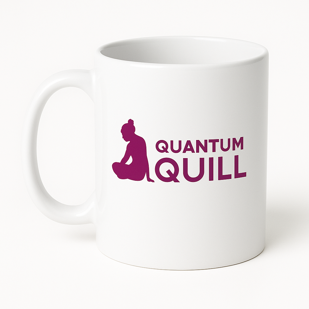 Taza blanca clásica con el logo Quantum Quill en color magenta. Ideal para café, té o cualquier bebida caliente.