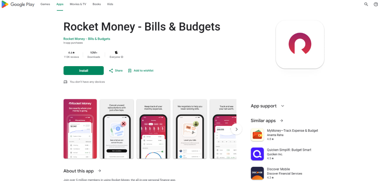 Rocket Money (antes conocida como Truebill) es una aplicación todo-en-uno que simplifica la gestión de tu vida financiera. Desde un solo panel, puedes:
